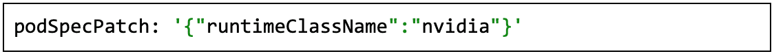 3. Patch the YAML. For any component that has a resource request of nvidia.com/gpu, add podSpecPatch: ‘{“runtimeClassName”:”nvidia”}’ to the component’s YAML.