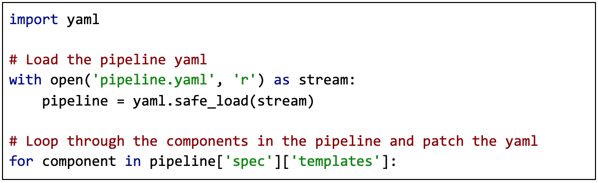 This code block will loop through all the components in the pipeline and check if the component requests GPU resources. If it does, it will add a podSpecPatch to the component with the runtimeClassName set to nvidia. The patched pipeline is then written to a new file called patched_pipeline.yaml.