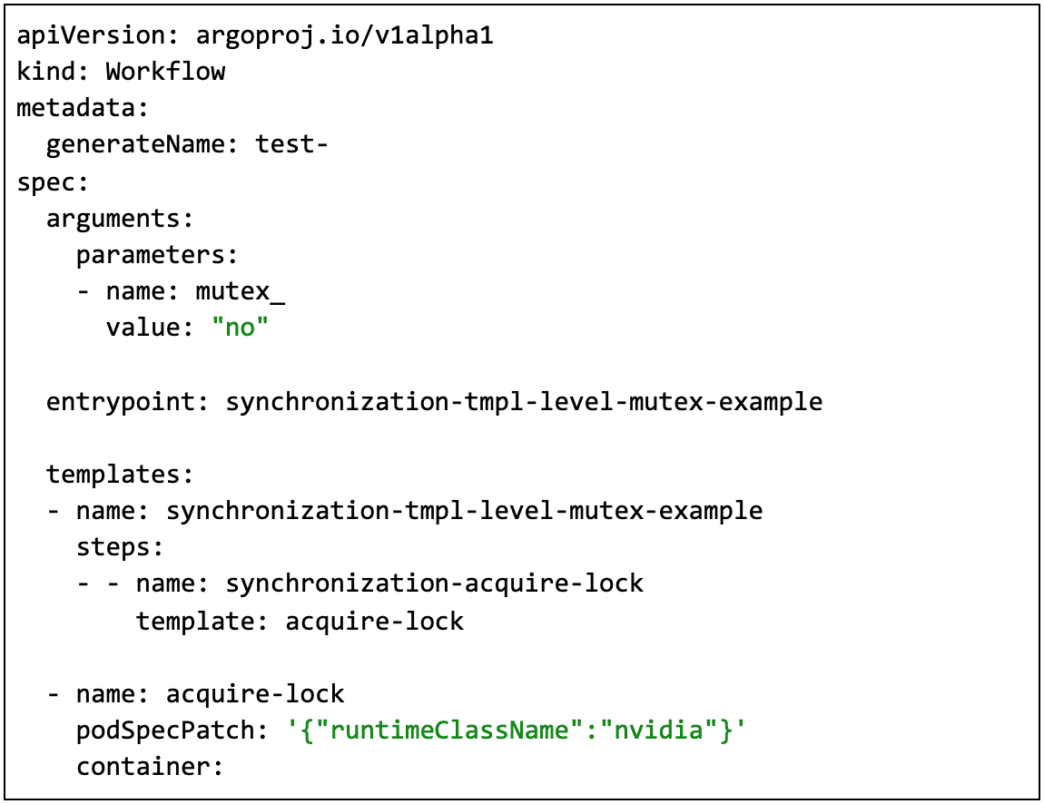 Since we know that Kubeflow Pipelines generate Argo Workflow YAML files when we compile pipeline code, we can modify these YAML files to add the runtimeClassName field to the Podspec of components that require GPUs.